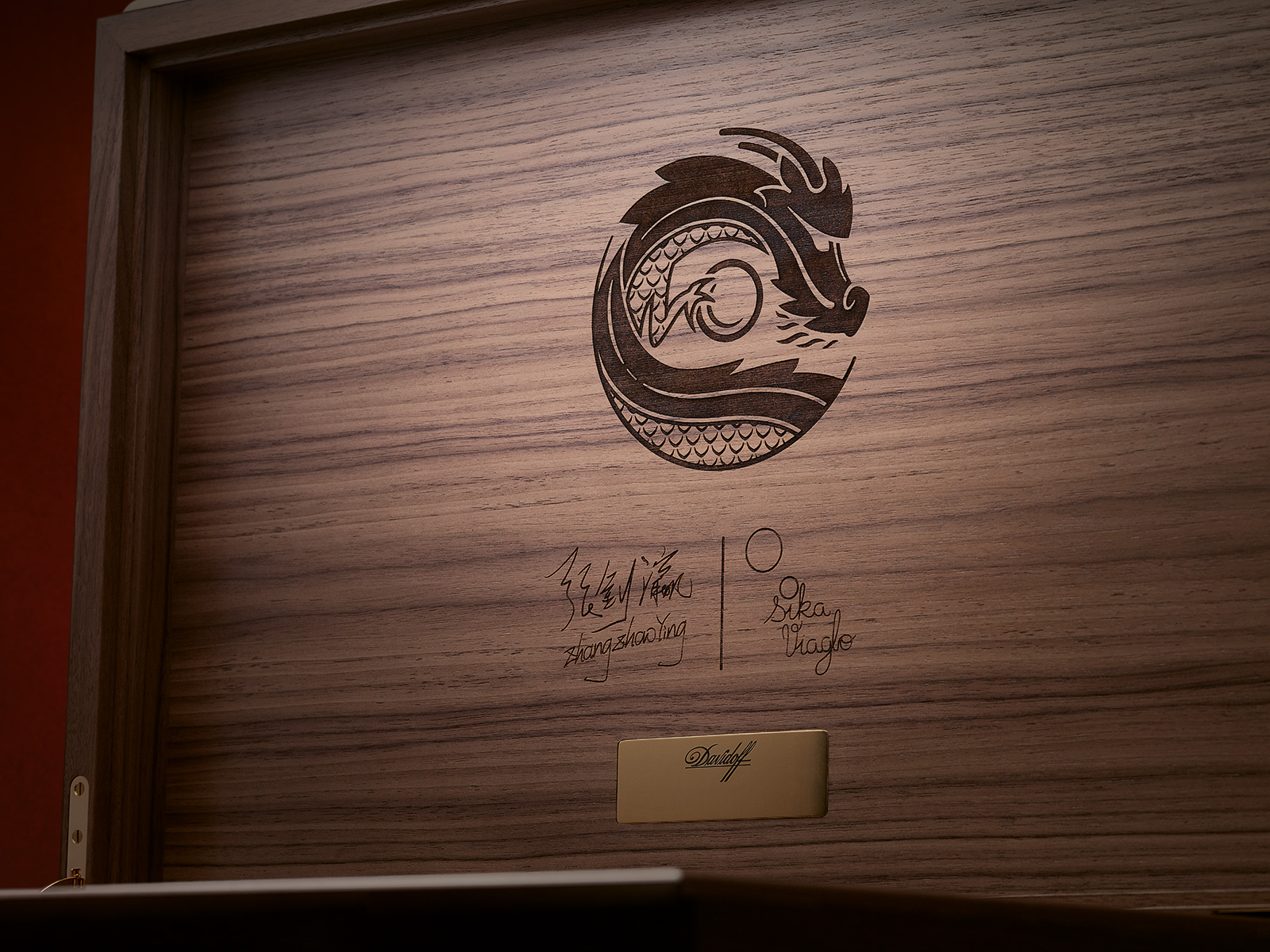 Das Kunstwerk auf dem Humidor lädt die Betrachter zu einer faszinierenden Reise in die mythischen Länder des Fernen Ostens ein, wo die Legende vom Drachen und seinem Sohn ihren Lauf nimmt. Um das Kunstwerk auf dem Humidor zum Leben zu erwecken, schlüsselte Sika das Gemälde von Zhang Zhaoying in Hunderte von perfekt geformten Stücken auf und platzierte sie in akribischer Handarbeit auf dem Humidor – eine Detailarbeit, die ebenso viel Präzision erfordert wie die Herstellung der exklusiven Davidoff Zigarren, die sich im Humidor befinden. Es kostete sie über 200 Stunden, um das Kunstwerk an einem einzigen Masterpiece fertigzustellen, da sie das Mosaik Stück für Stück ausschnitt und zusammensetzte.