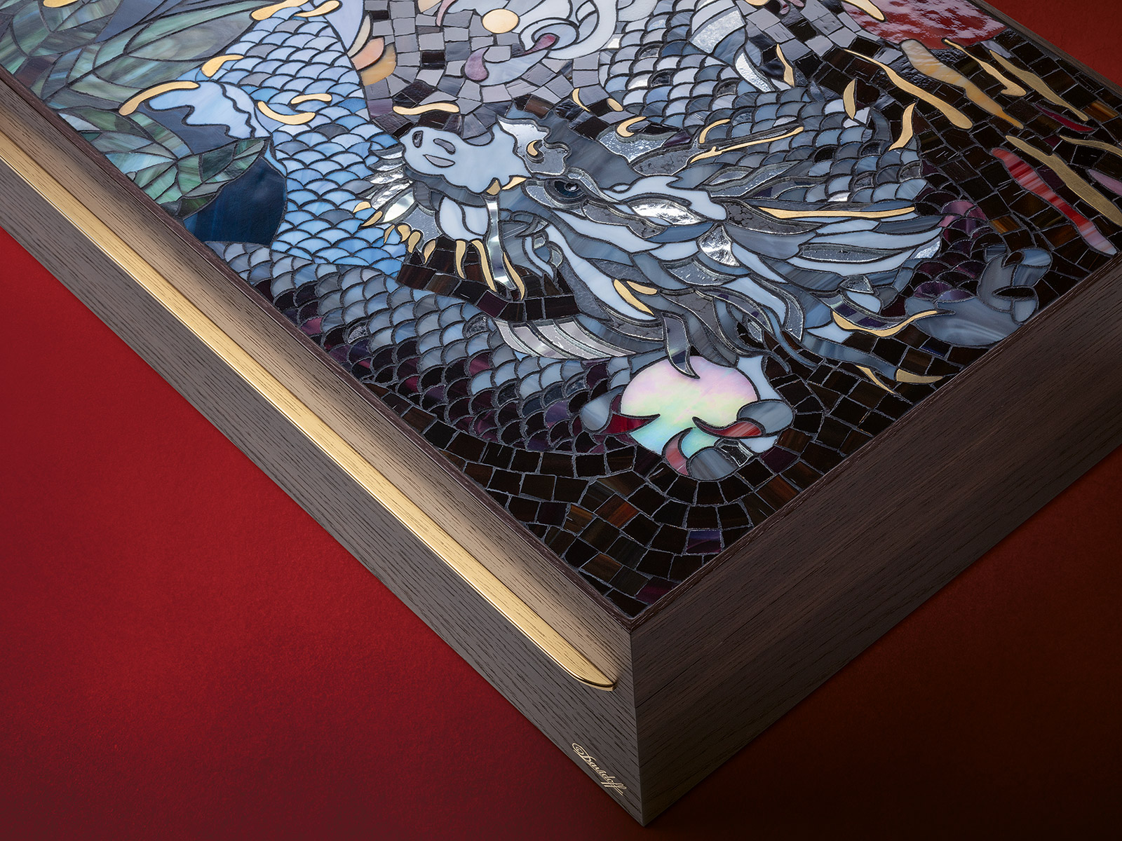 Das Kunstwerk auf dem eindrücklichen Year of the Dragon Masterpiece Humidor wurde vom chinesischen Künstler Zhang Zhaoying designt und von der französischen Mosaizistin Sika Viagbo in ein feines und faszinierendes Mosaik aus Glas- und Spiegelstücken übersetzt.